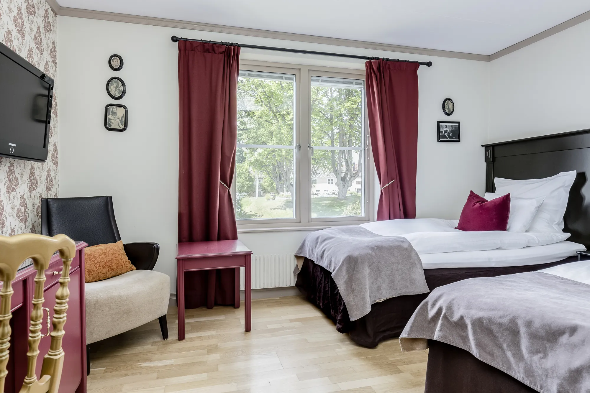 Kopplingen till vår historia går som en röd tråd genom våra standard rum. Ombonade tyger, tapeter i tidstypiska färger, sober belysning och helkaklade badrum. Naturligtvis finner ni en bekväm arbetsplats i dessa rum, ibland måste man även göra sina ”måsten”.